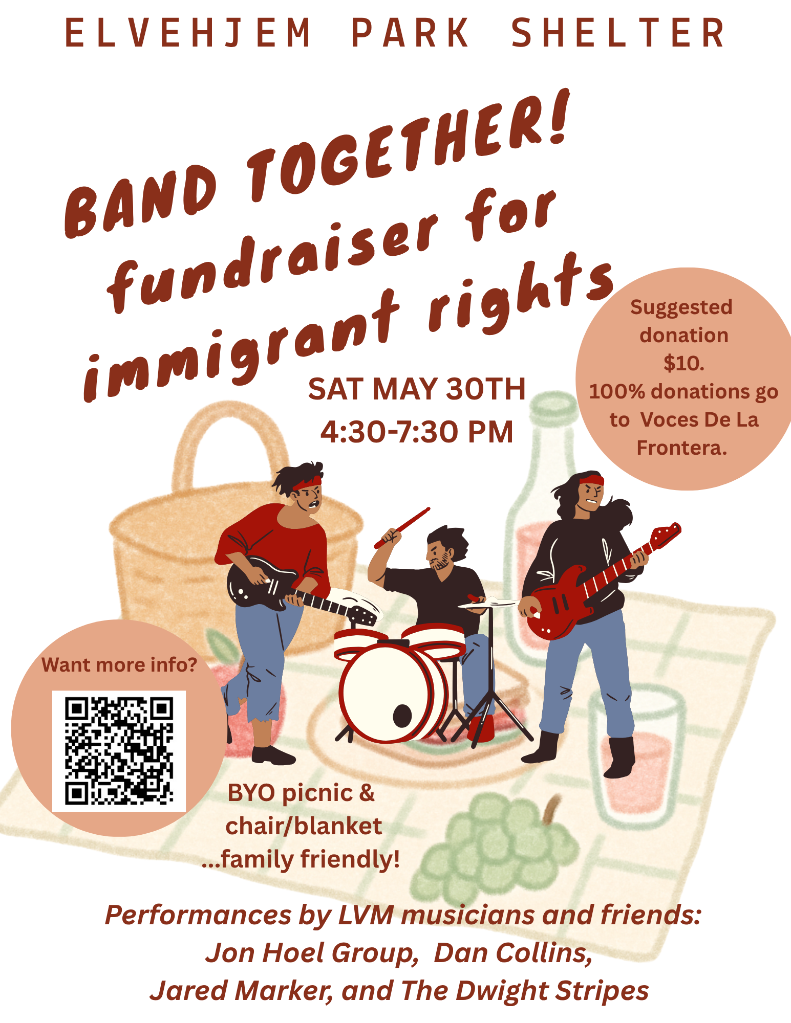Join us for this casual, drop-in style, outdoor music event to raise funds for immigrant aid in our area. Please bring your family, a picnic, chair/blanket, and together let’s enjoy our community and neighbors, while working to make a difference!