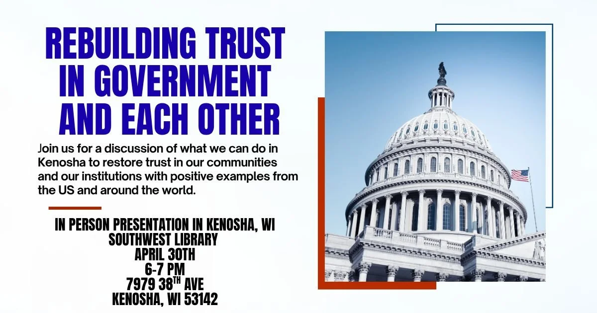 Back to All Events Rebuilding Trust In Government and Each Other Thursday, April 30, 2026 6:00 PM 7:00 PM Southwest Library 7979 38th Ave Kenosha, Wisconsin, 53142 (map) Google Calendar ICS Join us for a discussion of what we can do in Kenosha to restore trust in our communities and our institutions with positive examples from the US and around the world.
